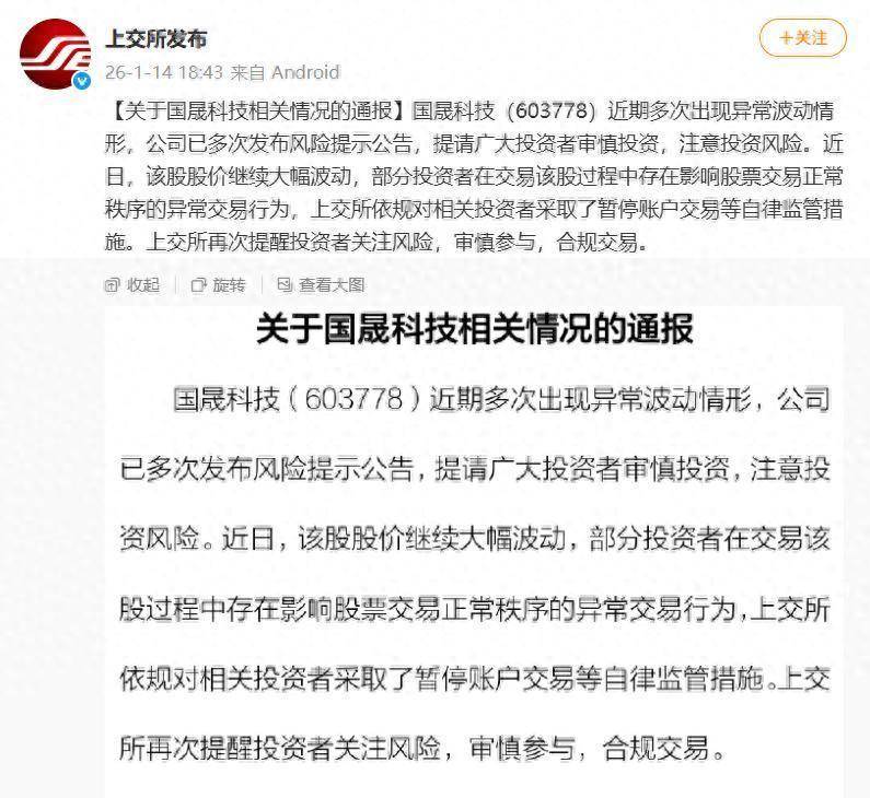 1月14日晚,上交所发布《对于国晟科技关系情况的通报》称,近日,国晟科技股价不竭大幅波动,部分投资者在走动该股经过中存在影响股票走动平淡步骤的特地走动举止,上交所依规对关系投资者取舍了暂停账户走动等自律监管范例。