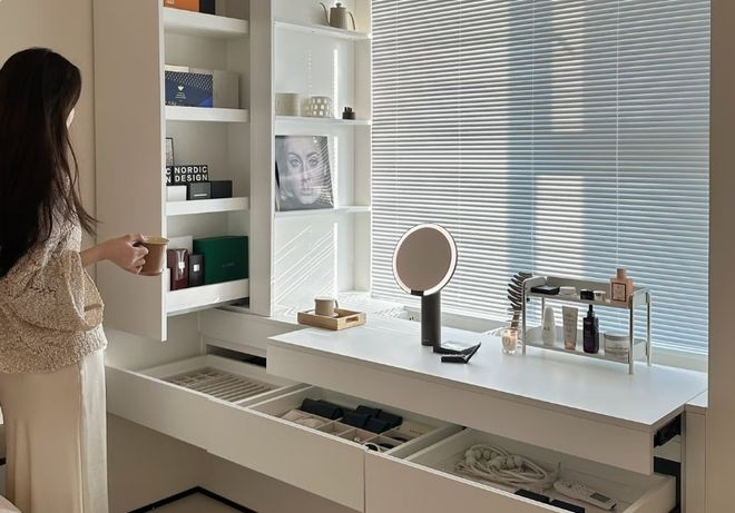 飘窗改成了多功能区,在这儿不错看书晒太阳,孩子还不错在这儿玩玩物。诚然了,也不错在这儿办公。而底下的抽屉,不错放许多的换季物品,不错说是一举多得。