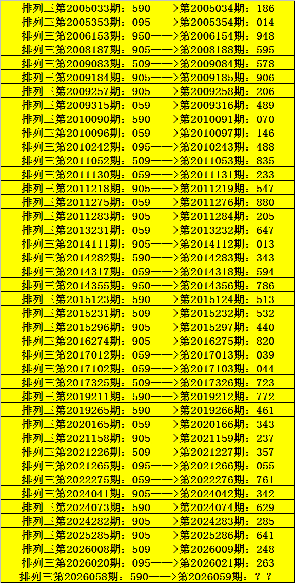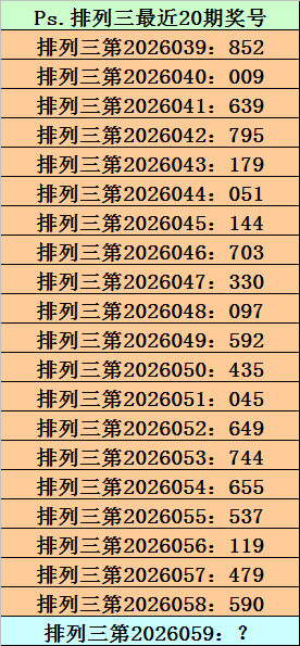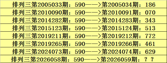 第2026058期罗列三奖号为590,历史上该号码组选开出42次,下期奖号区分为:186、014、948、595、578、906、206、489、070、146、488、835、233、547、880、205、647、013、343、594、786、513、532、440、820、039、044、723、772、461、343、237、357、055、761、342、629、285、641、248、263。