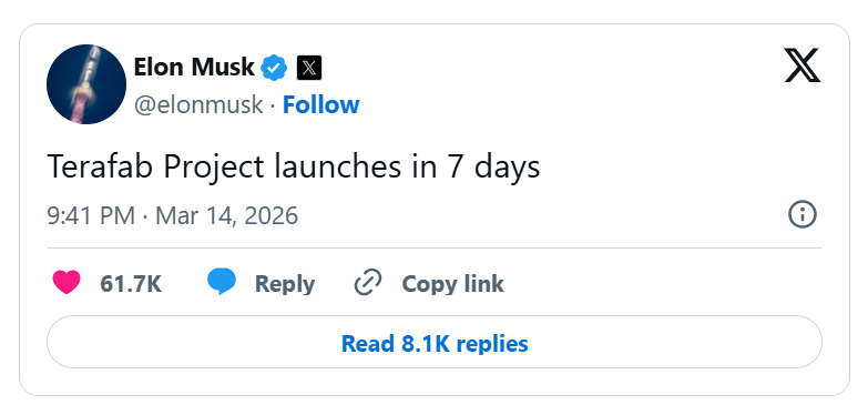 当地时候周六,特斯拉首席推行官埃隆·马斯克在X上发文默示,该公司旨在制造东谈主工智能(AI)芯片的Terafab边幅将在七天后启动。