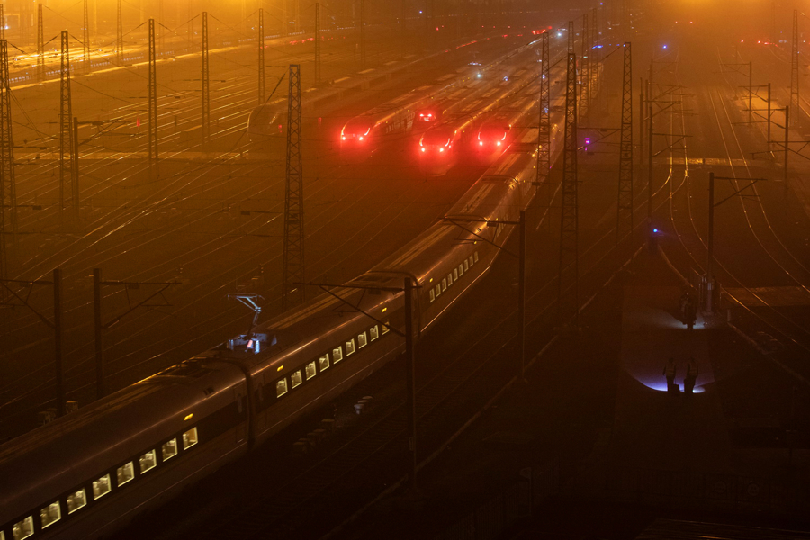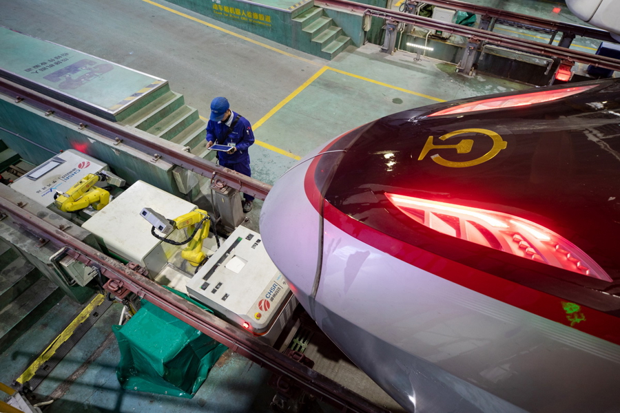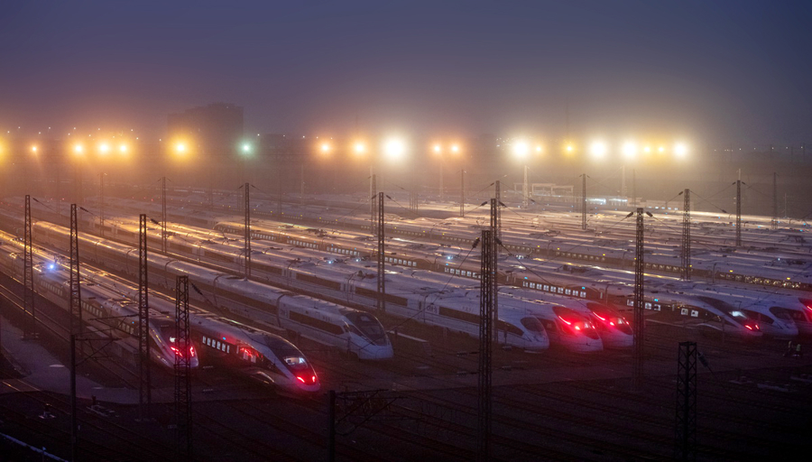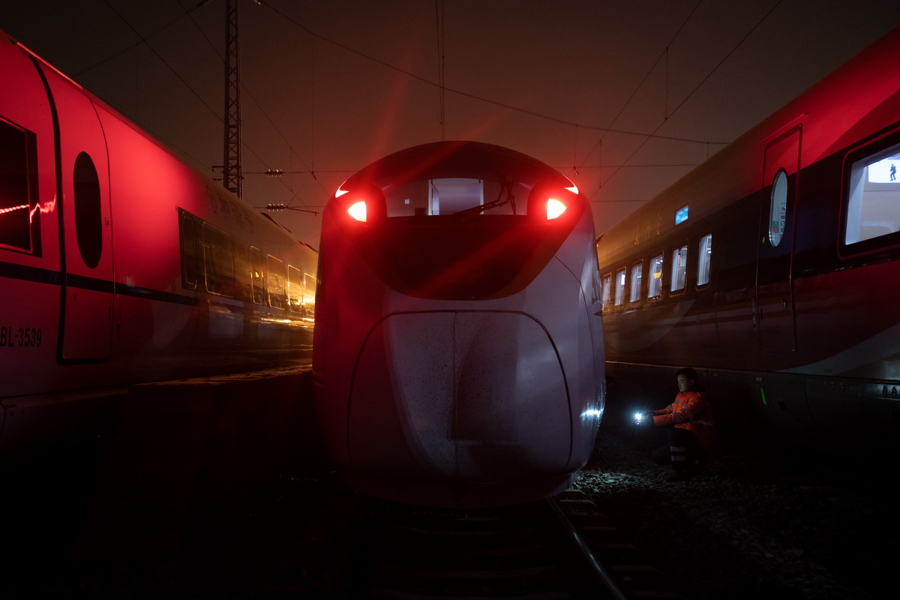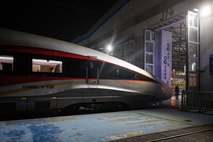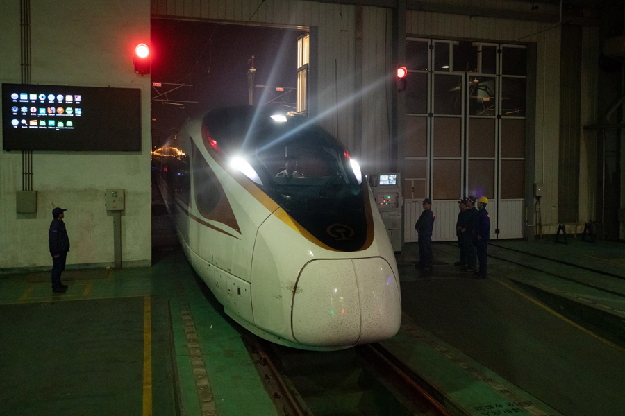 晚上23:03,一列最新一代智能动车组列车“放工回家”,正在入库。