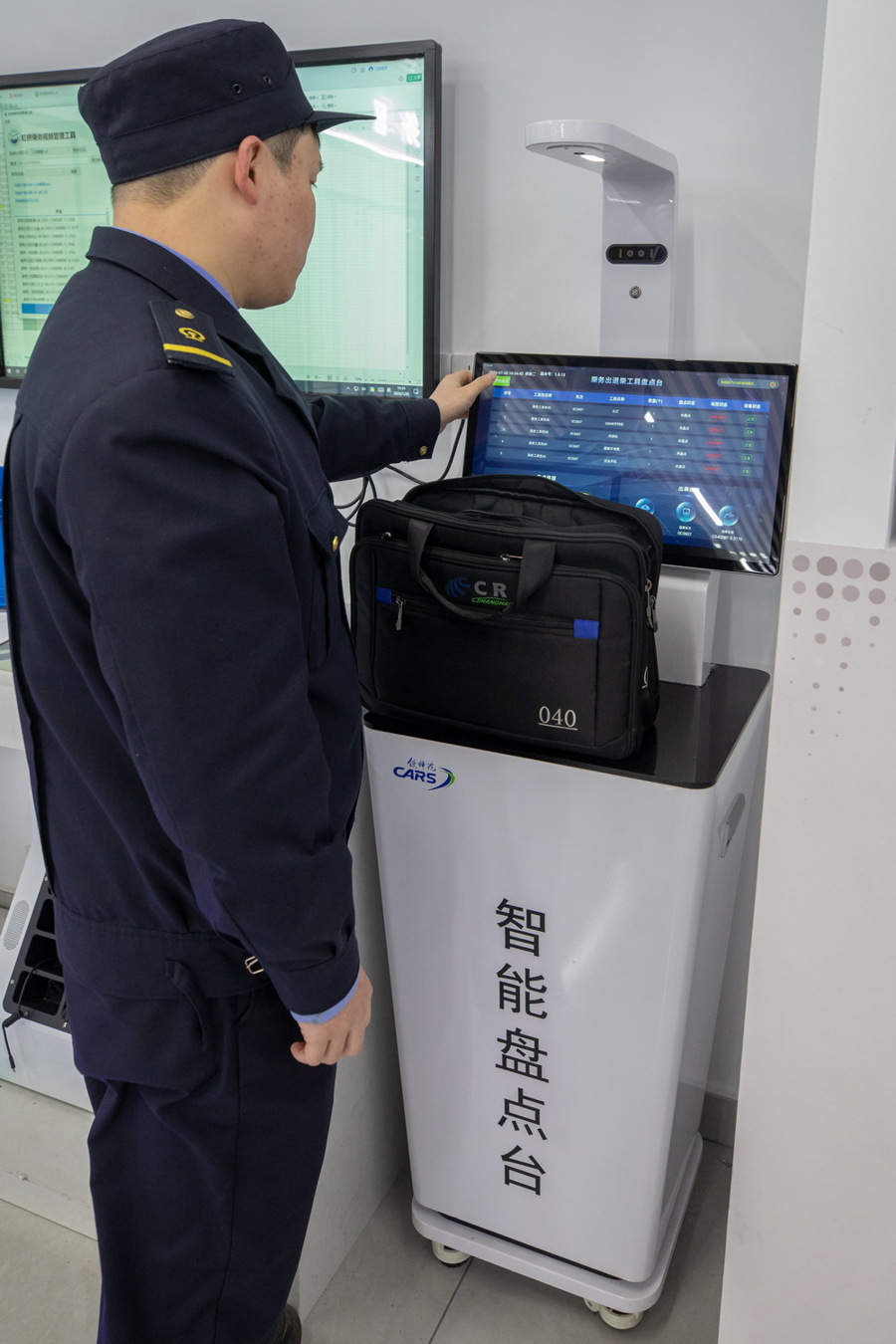 随车机械师正在作念出库前准备,依托出退乘器具盘货台自动盘货全部值乘器具工装,确保值乘无遗漏。