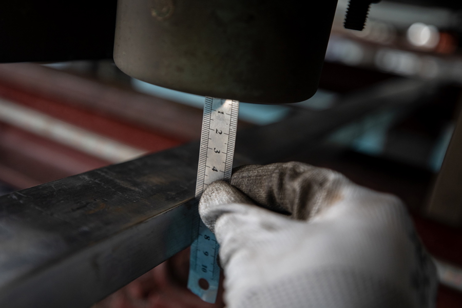 机械师们正使用专用器具清算边框上剩余的残胶。