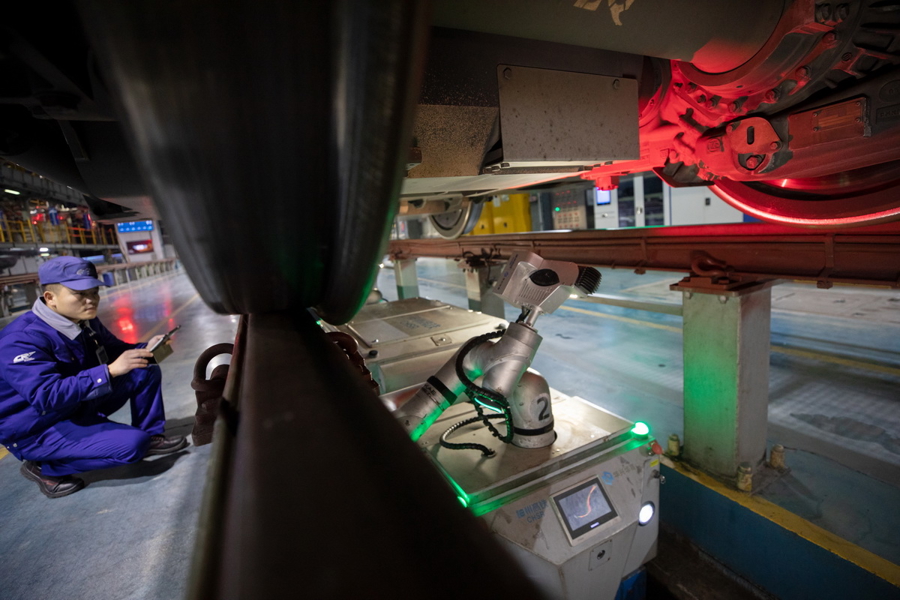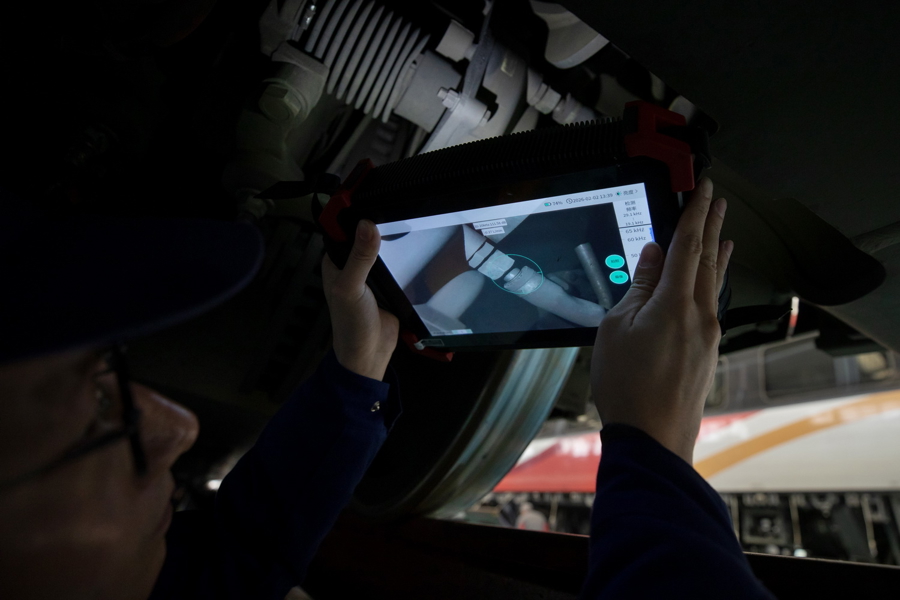 2月10日22:14,磨真金不怕火机器东说念主正在对动车组齿轮箱等进犯走行部件进行搜检,地勤机械师朱贵来正在复核机器东说念主检测出的故障点。