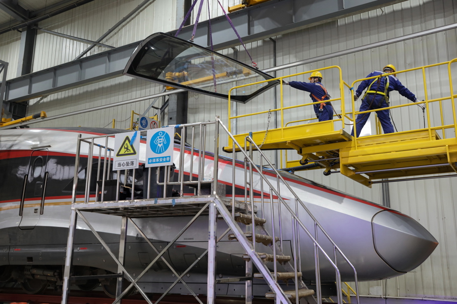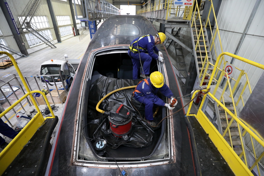 1月20日16:52,“虹桥动车诓骗所“虹心”后生突击队的队员们正加班加点更换因遭遇冰雪击打而蹂躏的动车组前挡风玻璃,备战春运。