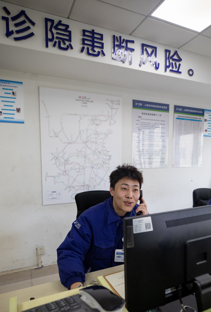 上昼8时半,虹桥动车诓骗所二级修班组正在召开开工前的任务嘱托会议,工班长周剑正在向组员庄重强调近期要点故障案例及关连属目事项。