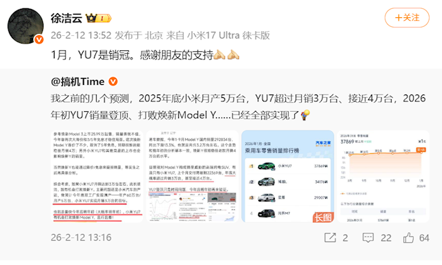 快科技2月12日音问,今天,小米集团董事长颠倒助理、策略市集部副总司理徐洁云援用汽车之家等平台数据发文示意:“1月,YU7是销冠。感谢一又友的复古。”