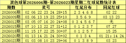 双色球第2026025期开出奖号为:02 03 15 20 23 24+10,红球余数散布为0 2 3 4 5,包含同尾红球:03 23。