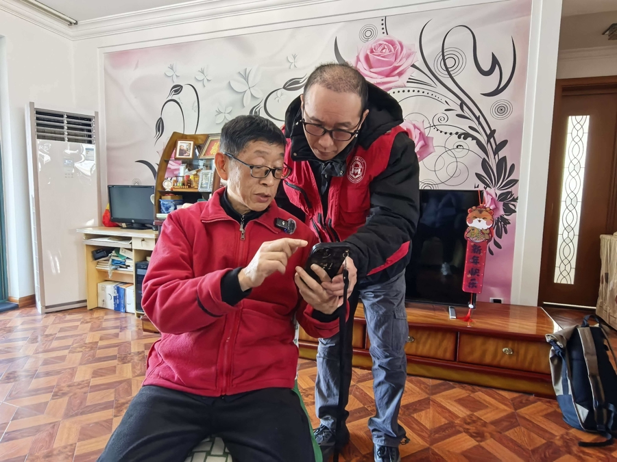 志愿者在教乐老伯使用AI语音点餐。周楠 摄