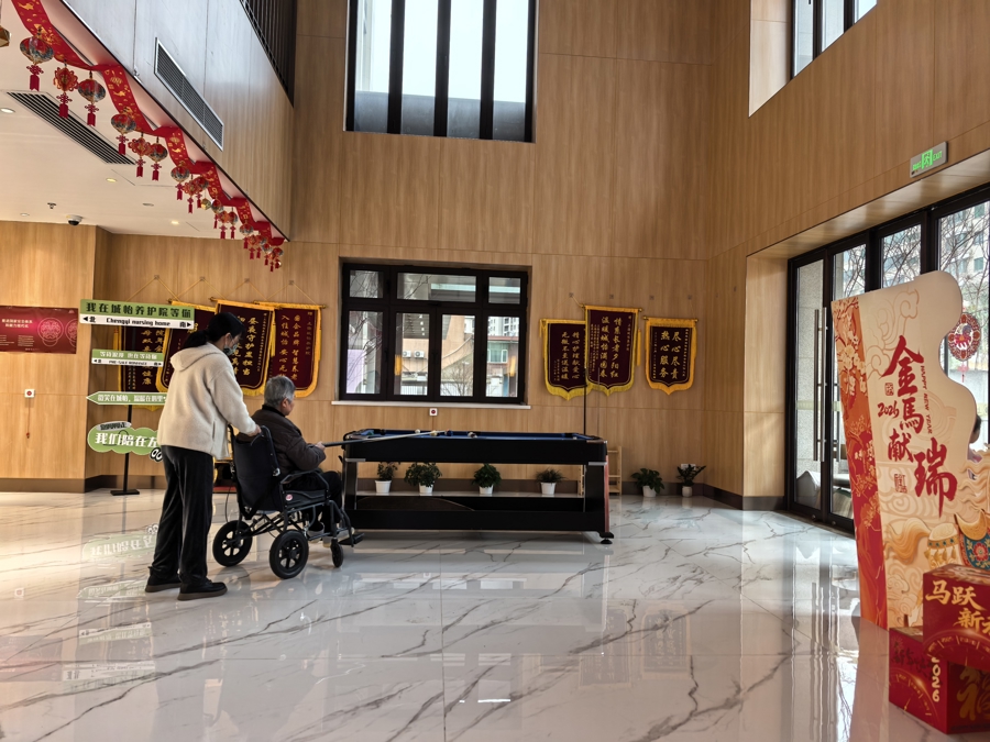 在上海普陀区城怡养护院,又名照顾员正在为老东谈主推轮椅。周楠 摄