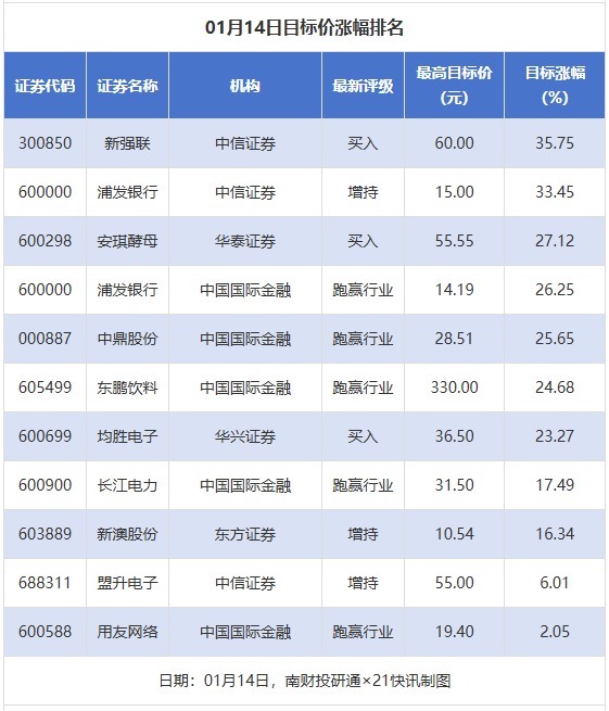 南财投研通数据露馅,1月14日,券商予以上市公司看法价共11次,按最新收盘价推测,看法价涨幅名次居前的公司有新强联、浦发银行、安琪酵母,看法价涨幅鉴别为35.75%、33.45%、27.12%,a8体育app鉴别属于风电配置、股份制银行、调味发酵品行业。