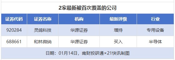 初度诡秘方面,1月14日券商共给出了2次初度诡秘,其中灵鸽科技、和林微纳获取华源证券鉴别予以“增握”“买入”评级。