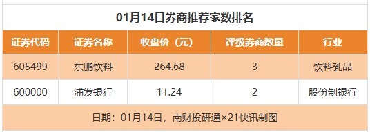 从券商推选门户来看,1月14日有17家上市公司得到券商推选,ag登录其中东鹏饮料获取3家推选,浦发银行获取2家推选,保利发展获取1家推选。