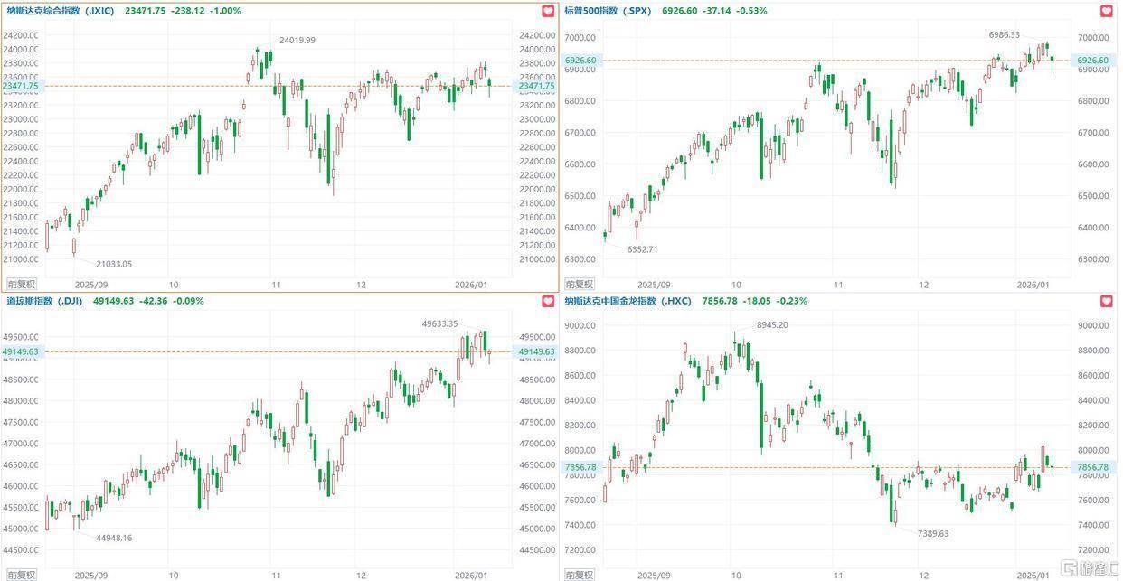 好意思股三大指数集体收跌,说念指跌0.08%,纳指跌1.00%,标普500指数跌0.53%。科技股普跌,甲骨文、博通跌超4%,亚马逊、微软、Meta跌超2%,英伟达、特斯拉、奈飞跌超1%。英特尔逆势涨超3%。