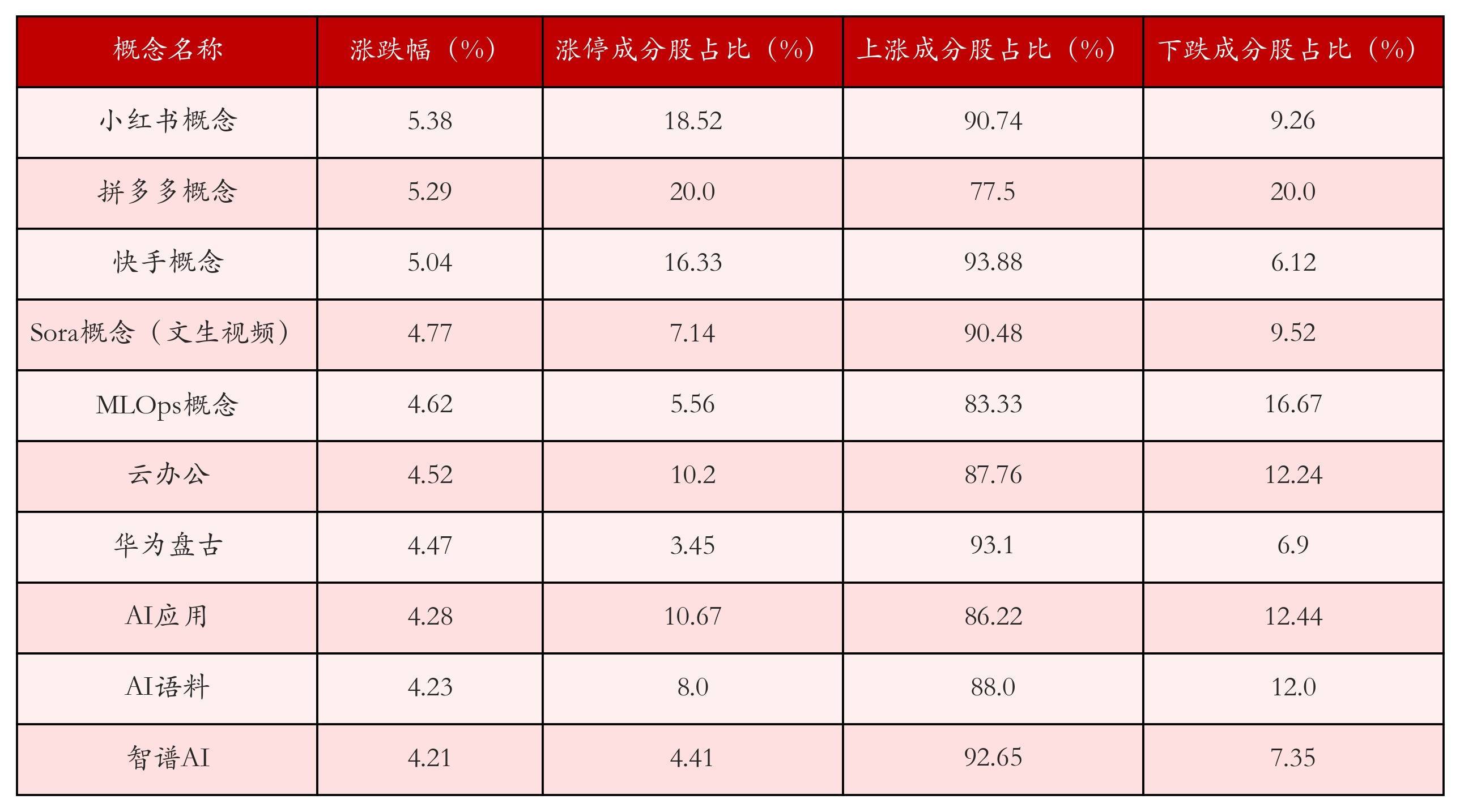 左证A股观念涨跌幅与所对应的股票池玄虚分析,涨幅靠前的三个观念板块折柳为:小红书观念、拼多多观念与快手观念。名次前10位的观念板块考虑数据见下表: