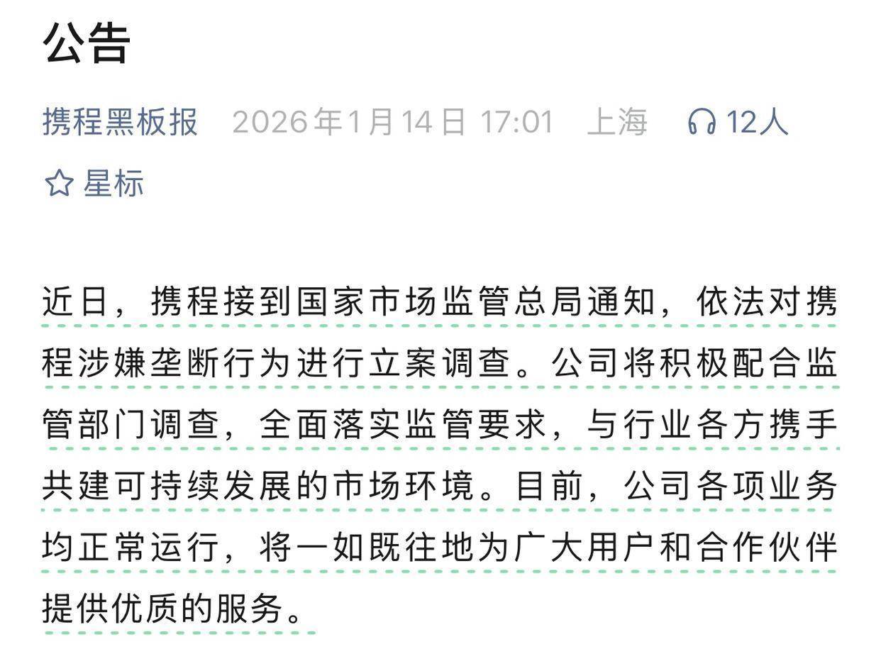 本日下昼17时,携程发布公告恢复称,近日,携程接到国度商场监管总局见告,ag官方app照章对携程涉嫌足下举止进行立案访问。公司将积极配合监管部门访问,全面落实监管条件,与行业各方联袂共建可抓续发展的商场环境。现在,公司各项业务均平常脱手,将一如既往地为雄壮用户和互助伙伴提供优质的工作。