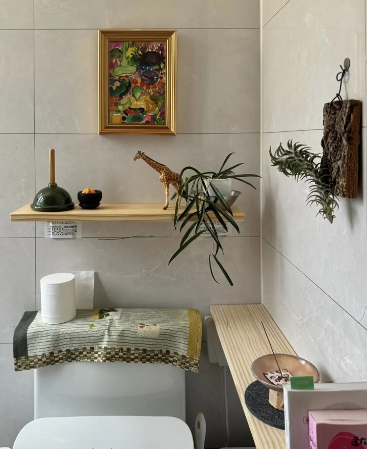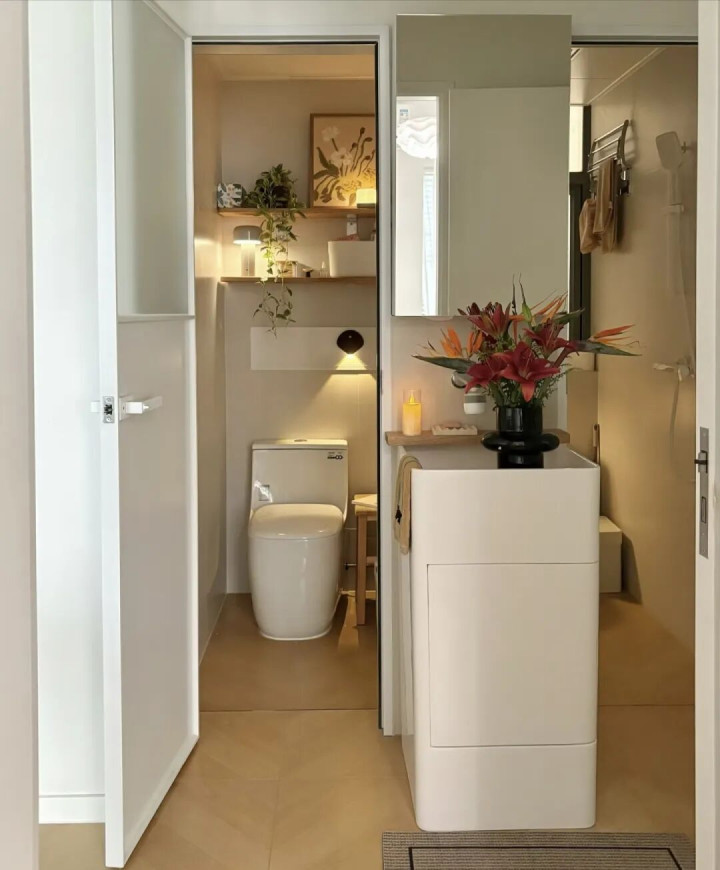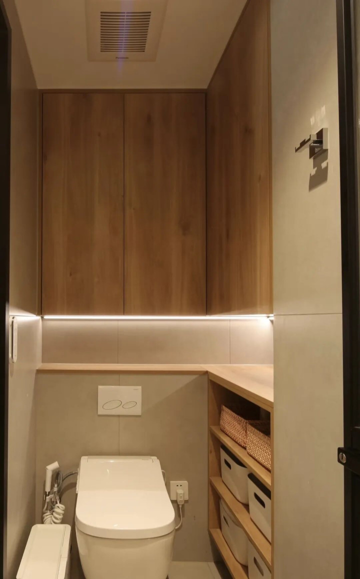 小卫生间的空间有限,二马桶背后的墙是一个被淡薄的收纳宝地。咱们可以接头策画储物柜梗概安安装物架,将卫生纸、清洁用品等放在这里,这么策画能处置许多收纳难题,既好意思不雅又实用。