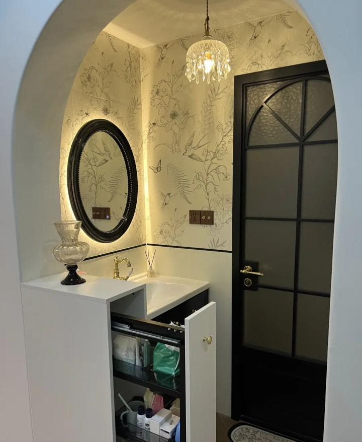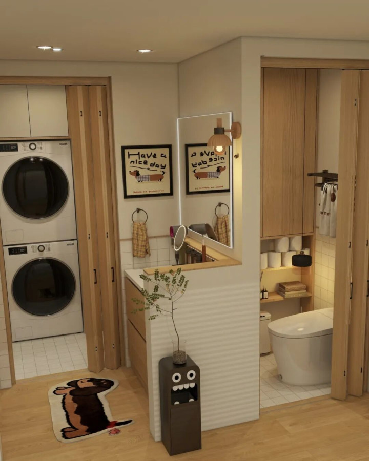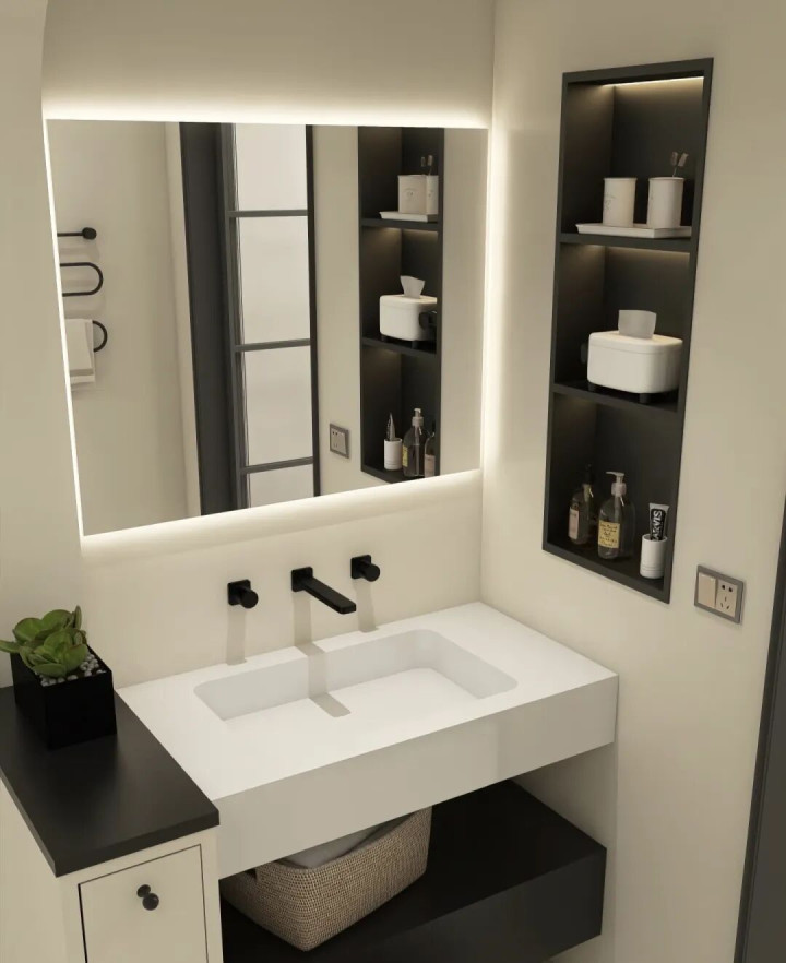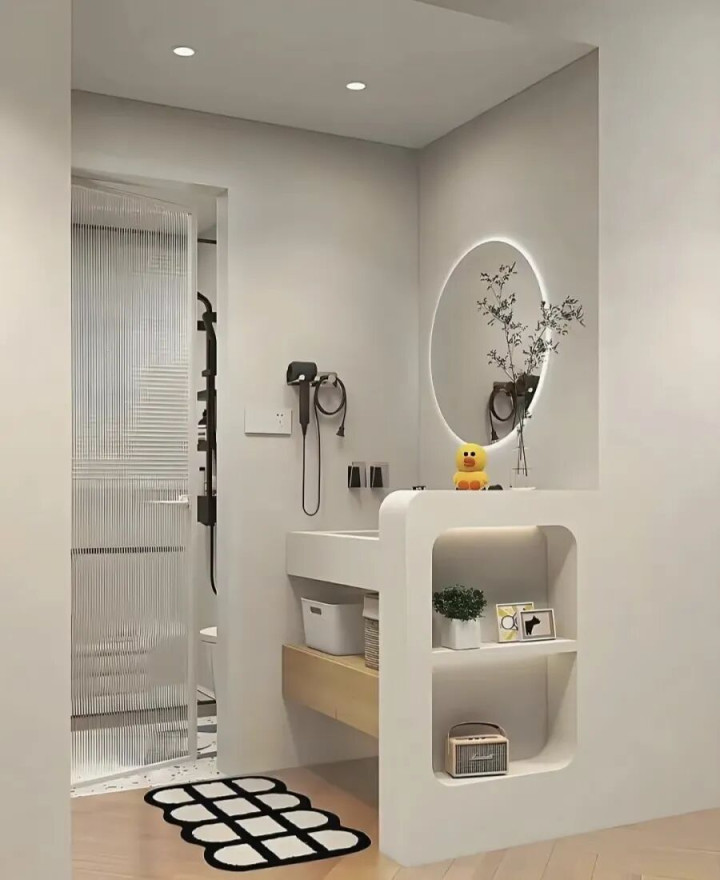 若有收纳需求,可以在半墙位置放弃矮柜或拉篮,不仅实用,还能充分应用空间。别忘了遴荐防水材质的柜子,毕竟,谁都不思看着柜子被水汽侵蚀而早早退休!