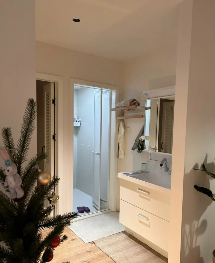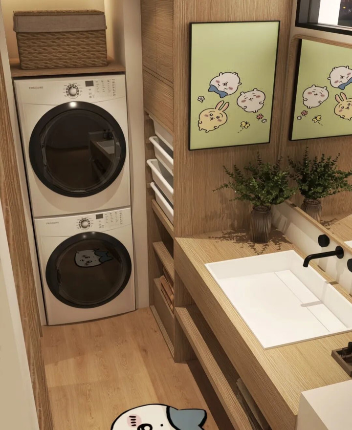 此外,洗衣区与浴室相邻,脱下来的衣物可以平直扔进脏衣篮里,的确方便得让东说念主心动。这么的策画完竣知足了全家东说念主同期使用卫生间的需求,互不侵略,真的辱骂常实用。
