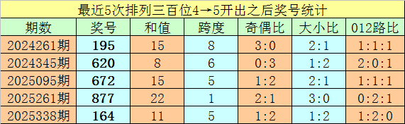 1、枚举三最近两期百位号码分裂开出4和5,历史上百位号码推断两期分裂开出4和5的奖号出现了88期。前五期开出之后其下期奖号分裂为:195、620、672、877、164;