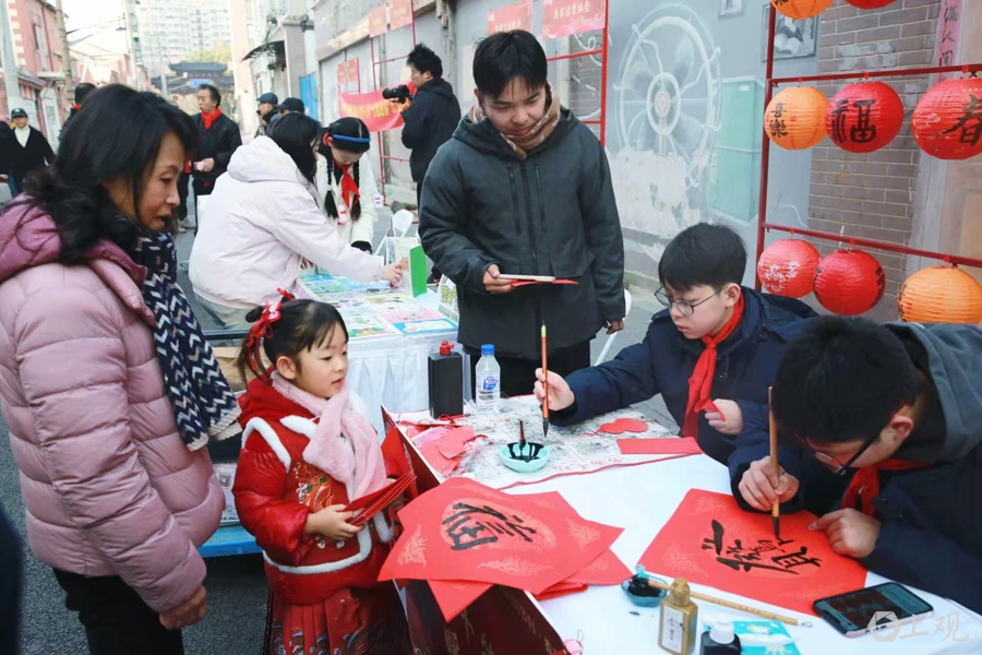 文庙路两侧,红红火火,来自各方的60多个单元、社团现场出摊新春主题集市,手写对子、非遗手工艺体验、老字号品牌展销、科技写联互动等实际,一站式满足市民赏习惯、购年货、品年味、玩新潮的多元需求。