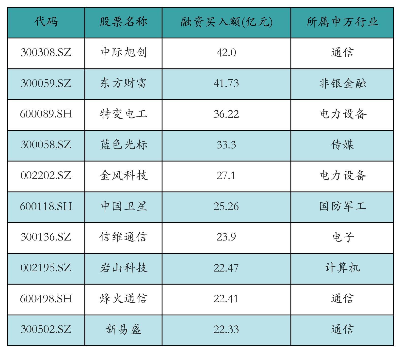 两市共有3474只个股有融资资金买入,其中中际旭创、东方资产、特变电工排行前三,买入金额隔离42.0亿元、41.73亿元、36.22亿元。融资买入额前10个股深信见下表: