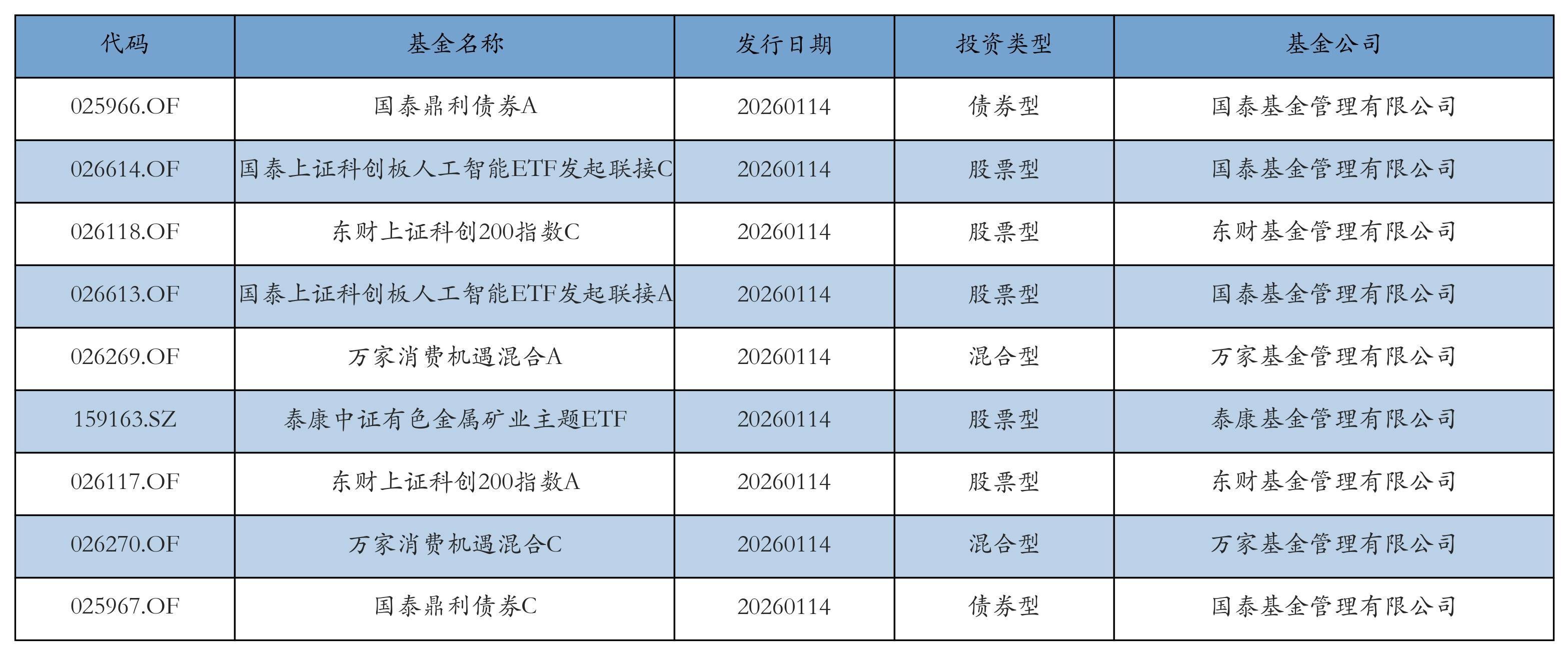 昨日有9只新基金刊行,隔离为:国泰鼎利债券A、国泰上证科创板东谈主工智能ETF发起酌量C、东财上证科创200指数C、国泰上证科创板东谈主工智能ETF发起酌量A、万家蹧跶机遇夹杂A、泰康中证有色金属矿业主题ETF、东财上证科创200指数A、万家蹧跶机遇夹杂C、国泰鼎利债券C,深信见下表: