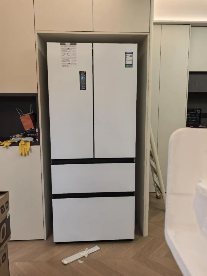 没钱大略没条款买信得过的镶嵌式雪柜,但又思要那种严丝合缝的高等感,于是把鄙俚雪柜硬塞进柜子里。