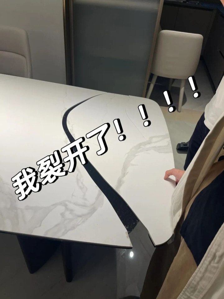 网友@筱芮说:她家买的岩板餐桌使用一周就裂开了,找了一大圈才发现,是因为垫层的木匠板变形导致的,好多姐妹买的岩板餐桌皆出现这种问题。