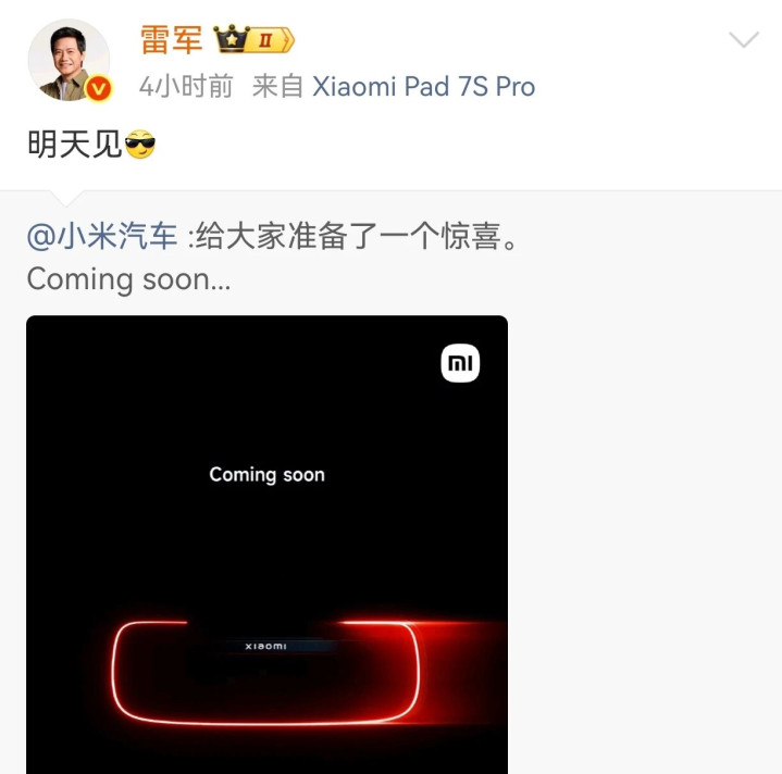 亦然在今天早上,@小米汽车 官方发布了一条微博,a8体育app骨子为“给内行准备了一个惊喜,Coming soon”,ag登录网址何况配图为暗红色环形尾灯局部预报图。同期雷军转发了这条骨子,并示意“未来见”。