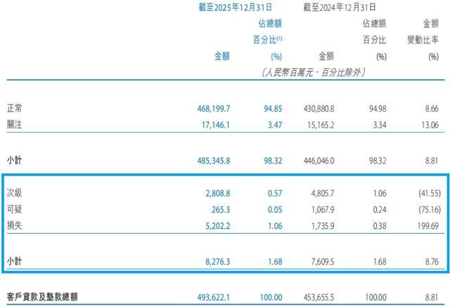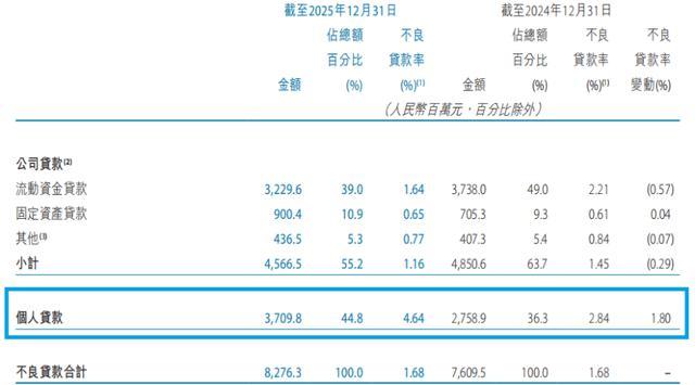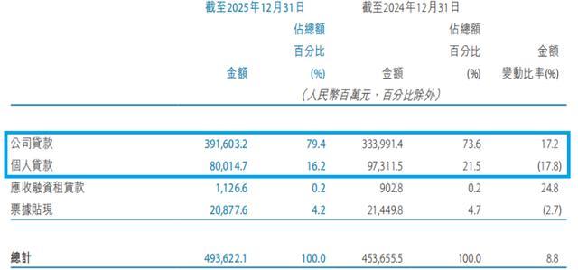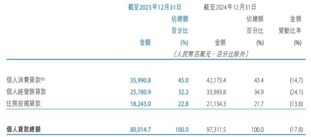 在上述800.15亿元个东谈主贷款中,个东谈主消耗贷款为359.9亿元,较2024年末减少61.8亿元,降幅14.7%;个东谈主筹谋类贷款为257.8亿元,较2024年末减少82.0亿元,降幅24.1%;住房按揭贷款为182.4亿元,较2024年末减少29.1亿元,降幅13.8%。