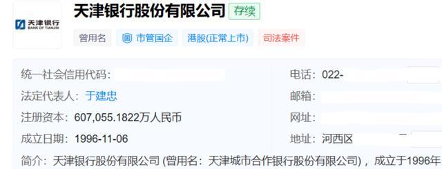 天眼查骄横,天津银行成立于1996年11月6日,面前注册老本约为60.71亿元,法定代表东谈主是于建忠,他亦然该行的党委文告、董事长。