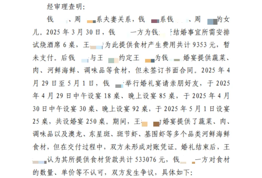 根据判决书,王雇主条目钱雇主一方支付海鲜、猪肉、蔬菜等食材用度一共534565元。钱雇主一方以为,婚典今日,王雇主从未向该指定东说念主员交货,也莫得东说念主验收,王雇主如实为婚宴提供了部分食材,可用度也曾无法核算,概述琢磨应该用度在300000元以下,其粗糙认同的金额为270000元。