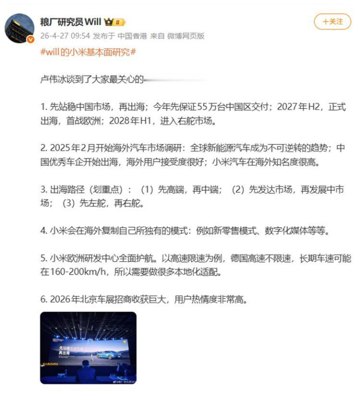 近日,自媒体博主“粮厂照应员Will”爆料,在小米集团投资者日上,卢伟冰表态称小米汽车将在2027年下半年崇敬出海。