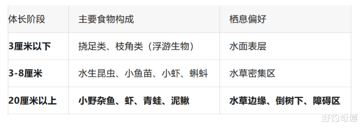 你看底下这组对于黑鱼食性的数据,就能昭着为啥选对地点比打重窝更紧要。证据究诘,体长20厘米以上的成鱼,主食一经酿成了小鱼虾和青蛙。也即是说,我们找的地点,必须得是这些“小鲜肉”衔尾的食堂,而不是光溜溜的深水区。