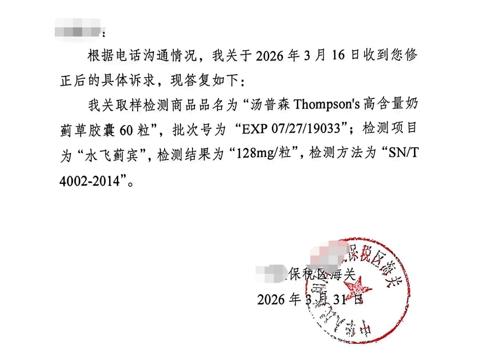3月31日,沿海某保税区海关书面回复花消者,根据投诉对保税区的汤普森产物抽检,线路每粒含量仅有128毫克。